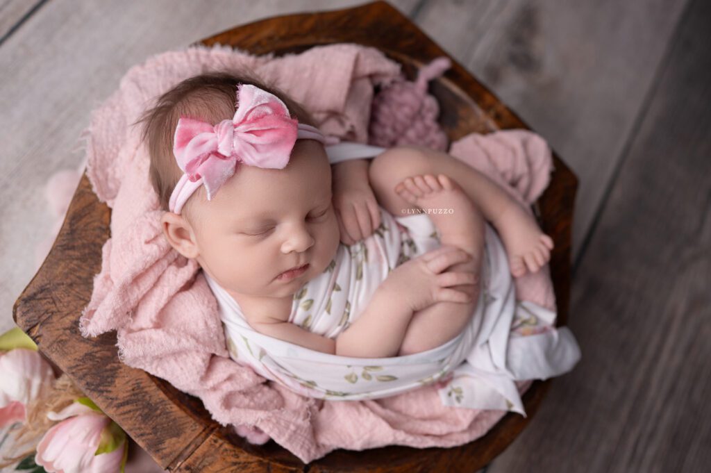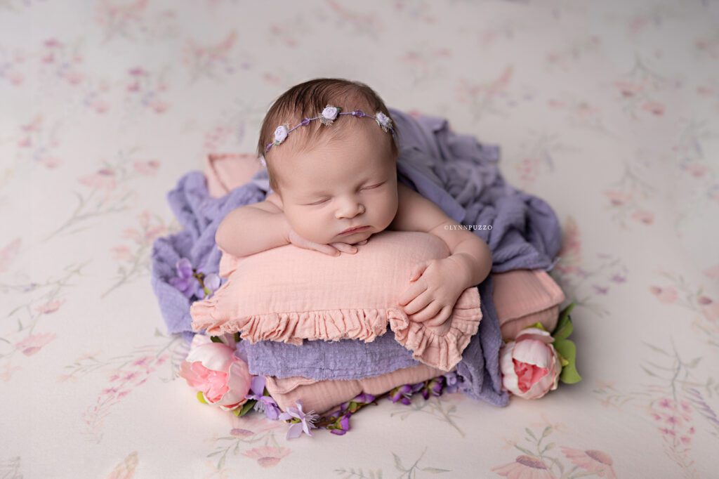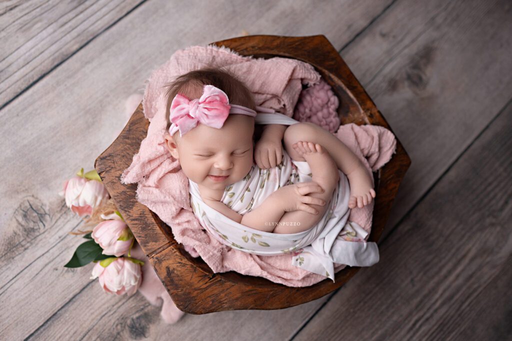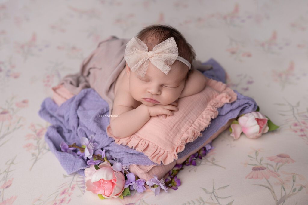 There is something incredibly special about photographing a newborn just as they’re beginning to stretch, yawn, and show tiny glimpses of their personality – and sweet Emilia’s soft floral newborn session was exactly that kind of magic.